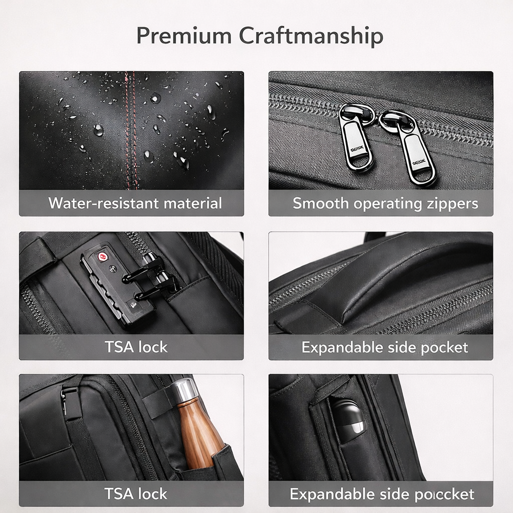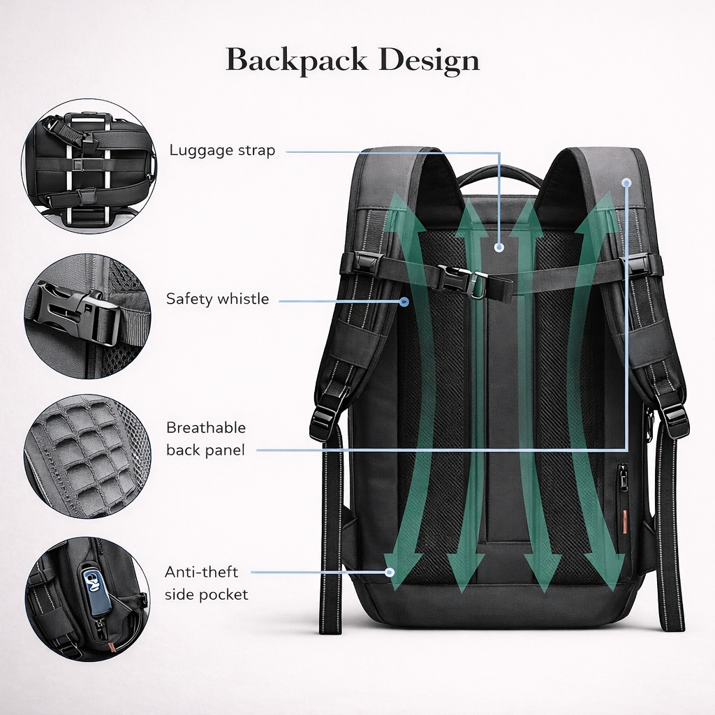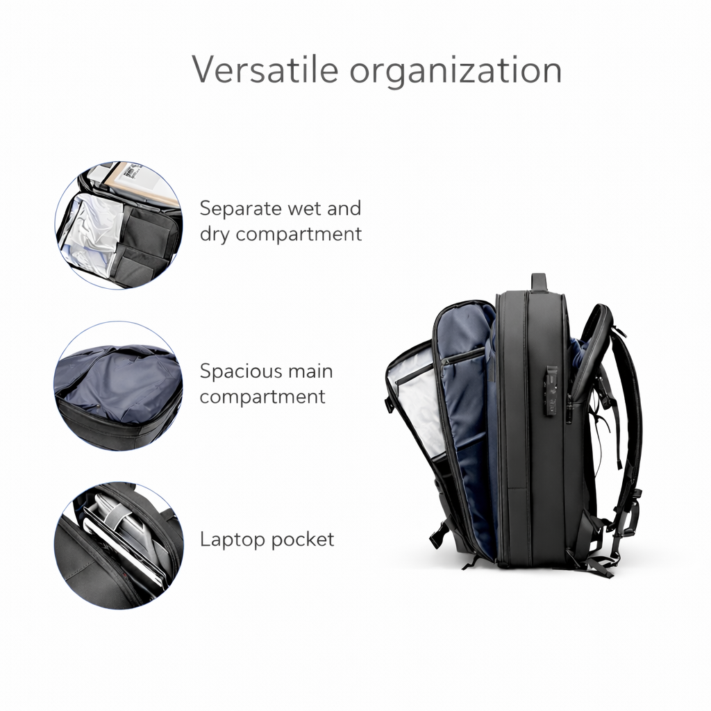 Wielokomorowa konstrukcja umożliwia wygodne oddzielenie laptopa, ubrań i akcesoriów, zapewniając maksymalny porządek.